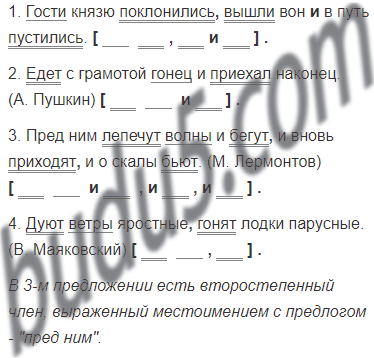 1. Гости князю поклонились вышли вон и в путь пустились. 2. Едет с грамотой гонец и приехал наконец. (А. Пушкин) 3. Пред ним лепечут волны и бегут и вновь приходят и о скалы бьют. (М. Лермонтов) 4. Дуют ветры яростные гонят лодки парусные. (В. Маяковский)
