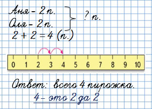 9. Аня и Оля помогали маме лепить пирожки. Аня слепила 2 пирожка, Оля — столько же. Сколько всего пирожков слепили девочки?