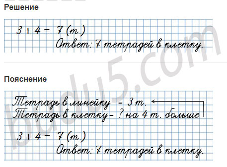 2. У Миши было 3 тетради в линейку, а в клетку на 4 тетради больше. Сколько тетрадей в клетку было у Миши?