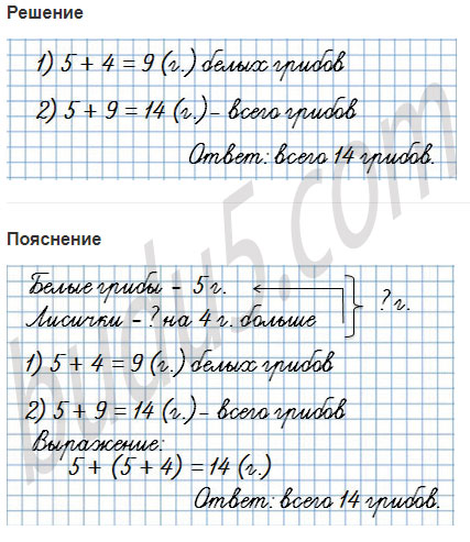 4. В корзине лежат белые грибы и лисички. Белых грибов 5, а лисичек на 4 больше, чем белых. Сколько всего белых грибов и лисичек в корзине?