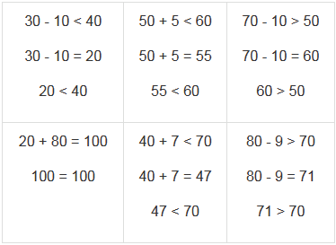 | 40 + 40 = 80 | 90 - 70 = 20 | 10 + 20 = 30 |
