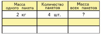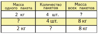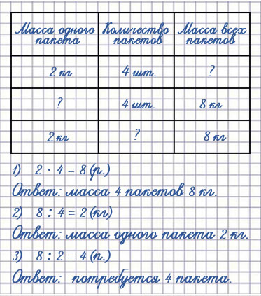 2) Масса 4 одинаковых пакетов с мукой 8 кг. Узнай массу одного пакета.
