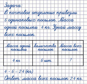 2. Составь свою задачу на нахождение массы нескольких одинаковых посылок, если известны масса одной посылки и количество таких посылок, и реши её.