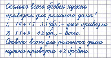 5. Для ремонта дома сначала привезли 18 брёвен, а потом ещё 15. Осталось привезти 9 брёвен. Поставь вопрос и реши задачу.