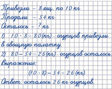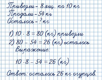В овощную палатку привезли 8 ящиков огурцов, по 10 кг в каждом. До обеденного перерыва продали 54 кг. Сколько килограммов огурцов осталось?