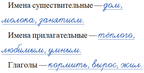 Выпишите из текста три имени существительных, три имени прилагательных, три глагола.
