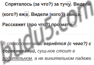 Образец. Спряталось (за что?) за тучу. Видели (кого?) ... .