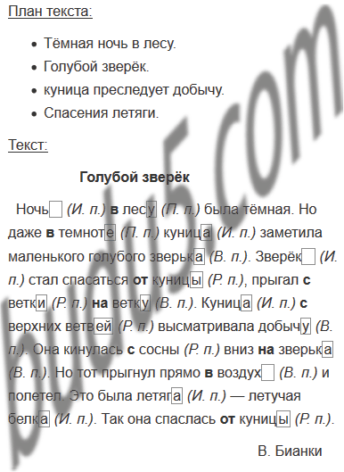 Расскажите, как летяга спаслась от куницы. Составьте и запишите план текста. Перескажите текст по плану. Запишите текст, вставляя нужные предлоги. Определите падежи имён существительных. Выделите их окончания.