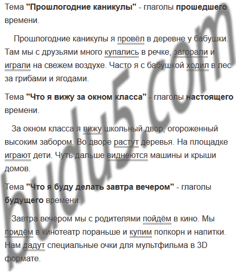 Подумайте, глаголы какого времени вы будете использовать чаще всего в рассказе о том, как провели прошлогодние каникулы; о том, что видите сейчас за окном класса; о том, что будете делать завтра вечером.