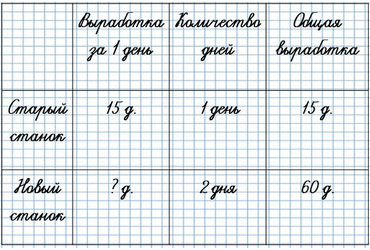 4. Дневная норма выработки у рабочего была 15 деталей. На новом станке он за 2 дня изготовил 60 деталей. Во сколько раз больше деталей изготовил рабочий за 1 день на новом станке?
