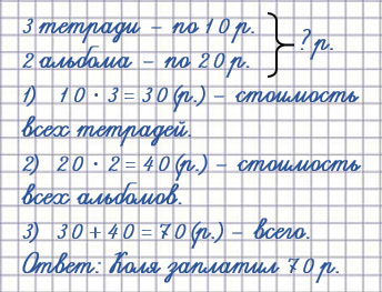 Коля купил 3 тетради по 10 р. и 2 альбома по 20 р. Сколько денег он заплатил?