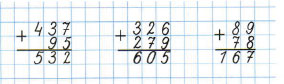 1) Пишу (единицы под единицами, десятки под десятками, сотни под сотнями): 437 + 95.