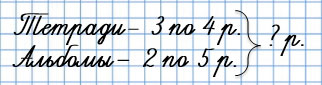 Коля купил 3 тетради по 4 р. и 2 альбома по 5 р. Сколько денег он заплатил?