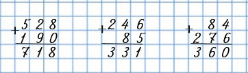 Пишу (единицы под единицами, десятки под десятками, сотни под сотнями): 528 + 190.
