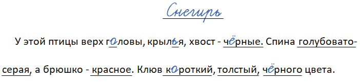У этой птицы верх г_ловы, крыл_я, хвост - ч_рные. Спина голубовато-серая, а брюшко - красное. Клюв к_роткий, толстый, ч_рного цвета.