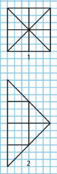 425. Начерти такие фигуры. Большой треугольник составлен из частей, на которые разделён большой квадрат. Раскрась одним цветом одинаковые фигуры на обоих рисунках. Сравни площади большого треугольника и большого квадрата.