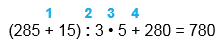 1) 285 + 15 = 300 2) 300 : 3 = 100 3) 100 • 5 = 500 4) 500 + 280 = 780 | |||||||||||||||