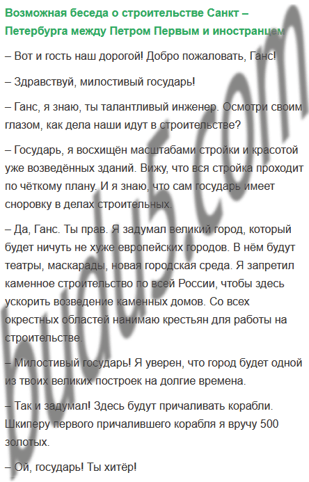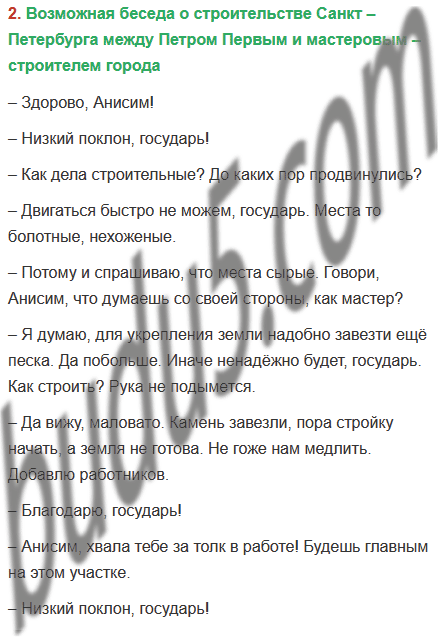 2. Придумай беседу о строительстве Санкт – Петербурга между: а) Петром Первым и мастеровым – строителем города; б) Петром Первым и иностранцем.