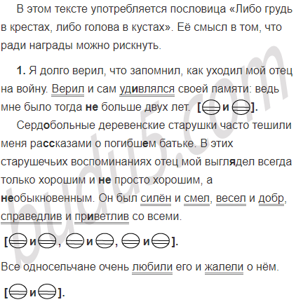 Сердобольные деревенские старушки часто тешили меня ра(с, сс)казами о погибш..м батьке. В этих старушечьих воспоминаниях отец мой выгл..дел всегда только хорошим и (не)просто хорошим а (не)обыкновенным. Он был силён и смел весел и добр справедлив и пр..ветлив со всеми. Все односельчане очень любили его и жалели о нём. Кузнец и охотник, он н..кого (не)обижал в своей жизни, а когда уходил на войну, сказал соседям, что будет ст..ять за родную землю так: «Либо грудь в крестах, либо голова в кустах».