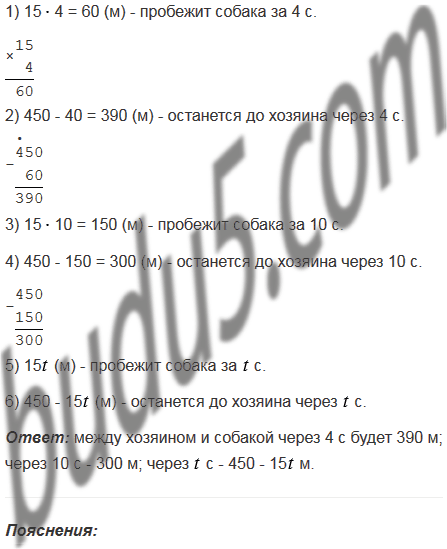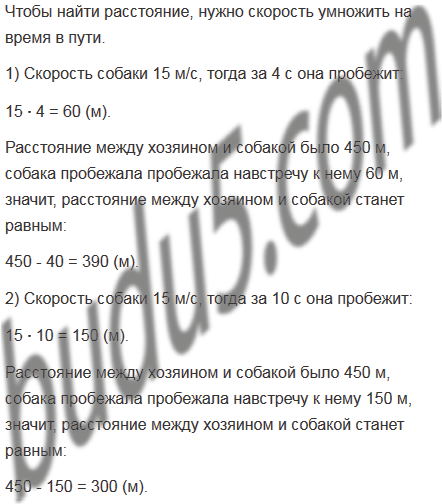 Собака увидела хозяина, когда была от него на расстоянии 450 м, и побежала к нему со скоростью 15 м/с. Какое расстояние между хозяином и собакой будет через 4 с; через 10 с; через
