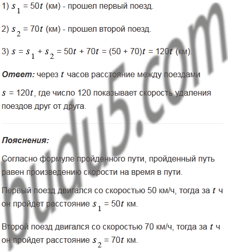 С одной станции в противоположных направлениях вышли два поезда в одно и то же время. Скорость одного поезда 50 км/ч, а скорость другого поезда 70 км/ч. Какое расстояние будет между ними через ч после отправления в путь? Запишите ответ в виде формулы и упростите ее. Что означает число 120 в получившейся формуле?
