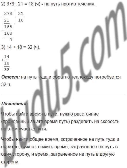 2) Расстояние между пристанями 378 км. Сколько времени потребуется теплоходу, чтобы проплыть туда и обратно, если его скорость по течению реки 27 км/ч, а против течения 21 км/ч?
