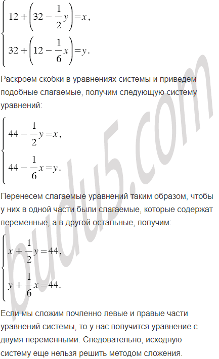 В одном баке было 12 л воды, а в другом - 32 л. Если первый бак долить доверху водой из второго бака, то второй бак останется наполненным на половину своего объёма. Если второй бак долить доверху водой из первого, то первый бак останется наполненным на шестую часть объёма. Найдите объём каждого бака.